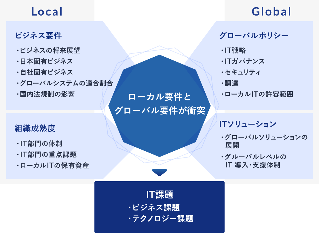グローバルシステムの有効活用、日本固有の業務要件の実現、ビジネスプロセスやセキュリティ等のグローバルポリシー準拠といった、グローバル企業特有の「要求事項=プレッシャー」を理解したITスペシャリストが、企画からプロジェクト化までを推進します。